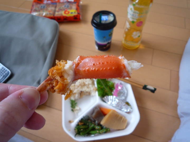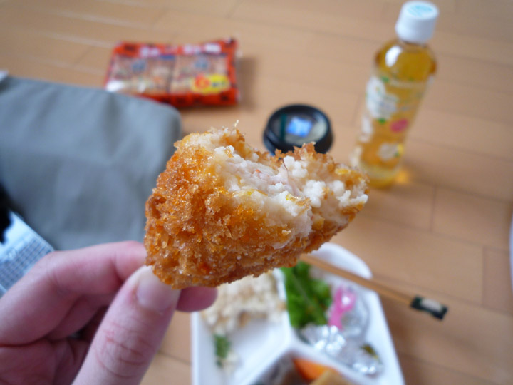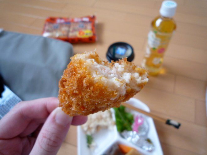 It may not look like much in its little foam container, but it had a surprise in store. The grocery store had probably 12 different options, and I chose this one because of what I thought was a panko-fried shrimp hiding there in the top right corner. You can’t go wrong with fried shrimp (except when you can, ahem). But after I bit into it, I discovered it was actually Japan’s version of the crab cake!