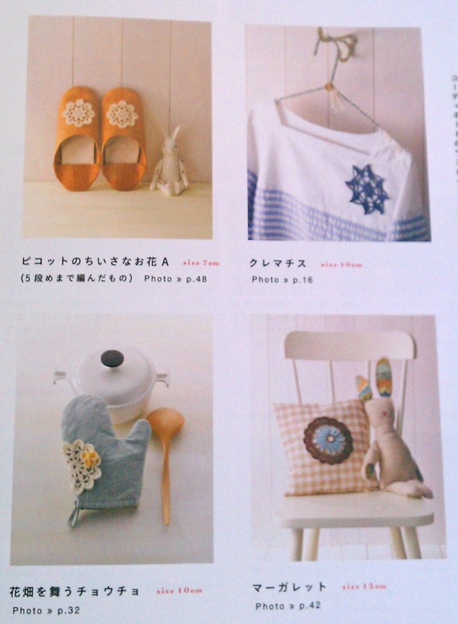 My friend from the States (featured here and here) is a crafter, but in a very different way than me.  She loves pretty things and is an ace with a crochet hook (whereas I prefer to stab at things, have never crocheted or made anything remotely wearable, and sometimes I like ugly things). When she visited Tokyo, we found this book: