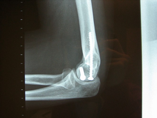 It was just a matter of too many patients to remember, but you can imagine my surprise at seeing two gigantic 3″ screws embedded in my arm. I’ve since grown quite fond of my bionic elbow, though, it never sets off airport metal detectors like I hope it might.