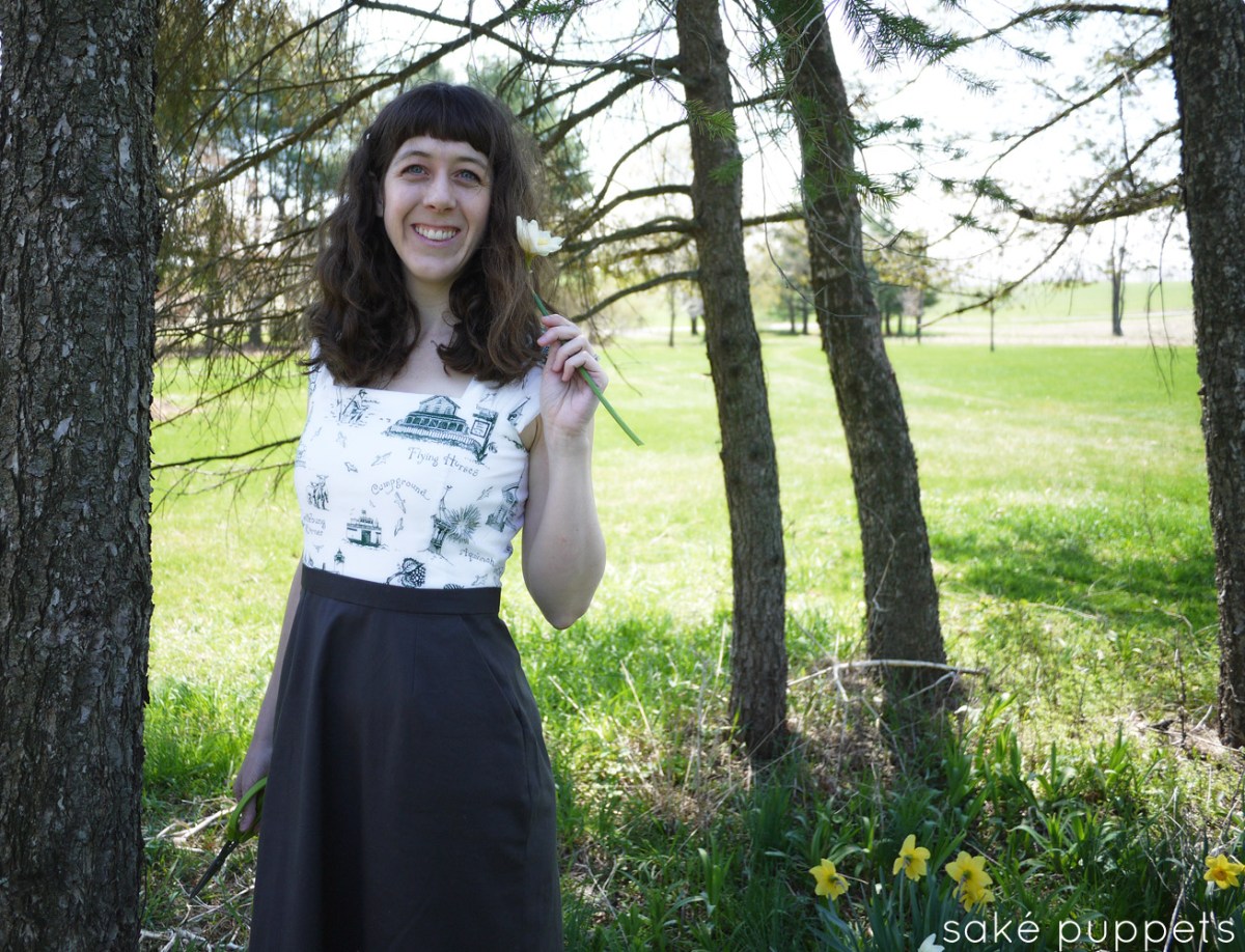 Practice Cambie dress by Saké Puppets, sakepuppets.com Published 21 April 2014 at 1307 × 1000 in A practice dress, some daffodils, and a barn cat ← Previous Next →