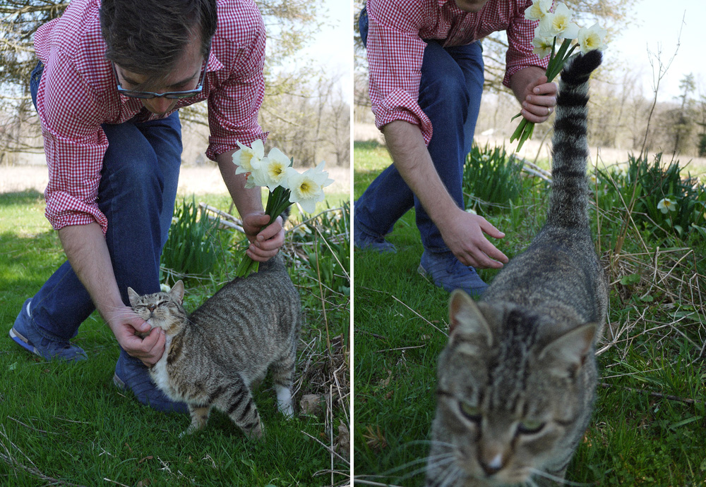 cat attack in a daffodil patch, sakepuppets.com Published 21 April 2014 at 1000 × 691 in A practice dress, some daffodils, and a barn cat Next →