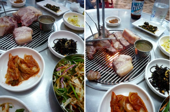 Our first night in Jeju, we went after an island specialty — grilled black boar. We were told that the pork came from the restaurant’s neighbor, which I believed, since we ate in a big tent over grills made from barrels. Never mind that the old guy running the place was flirting with me, he’d never make a story like that up, right?