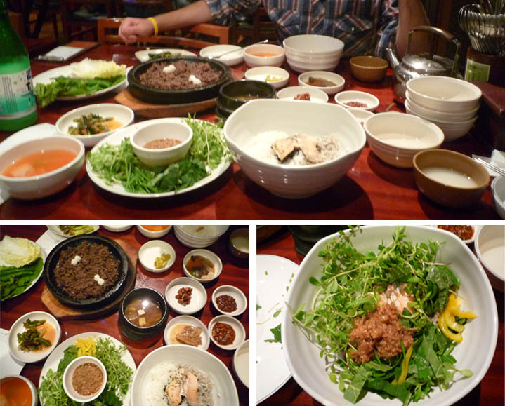 Then it was off to Seoul, and on our first night I made the ultimate mistake — I picked a restaurant out of my guidebook and we took a taxi across town looking for it, only to discover it was no longer there. Thankfully a very friendly salaryman took pity on us and led us to one of his favorite places instead. I was looking forward to trying something different — not all Korean food is cooked at the table, right? True, boribap was prepared in a location different from my table and was very tasty, though it was still very meaty, and very spi… well, you know.