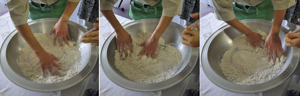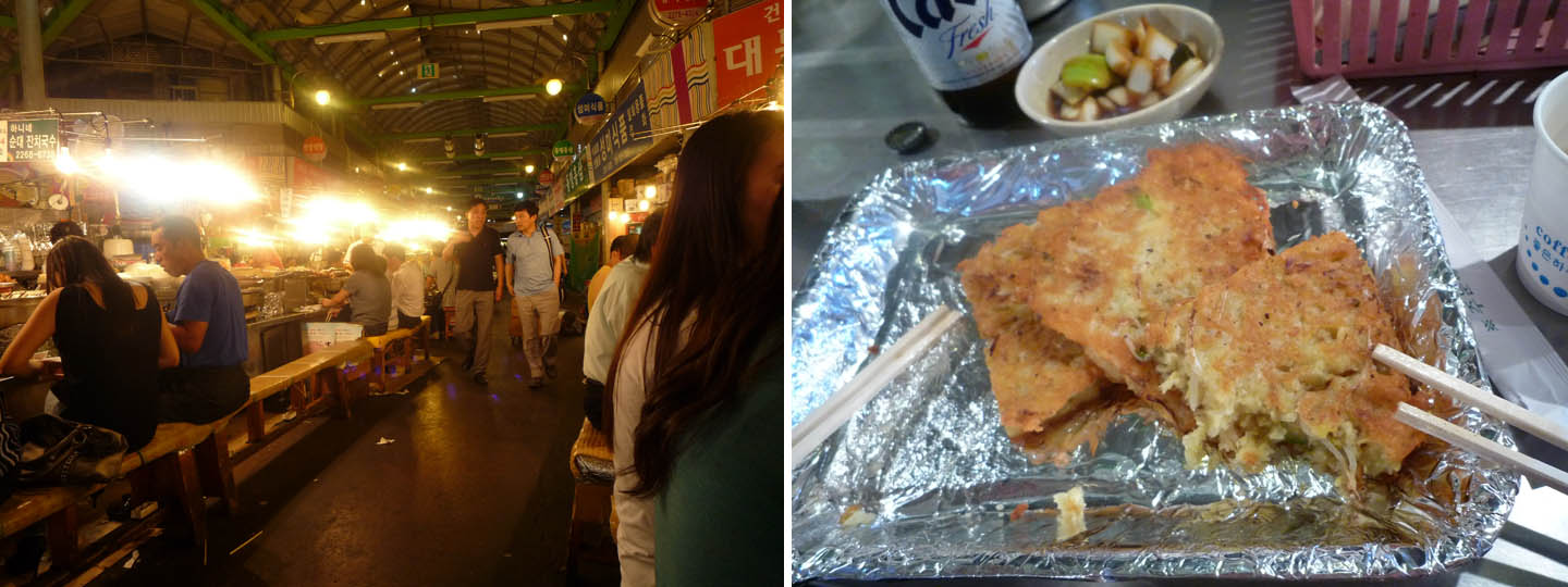 Clockwise, that’s a pronto pup with french fries fried directly into the batter, a doughnut cart, my doughnut of choice filled with black sesame and brown sugar, bindaetteok (mung bean pancake), and the night market where said pancake was consumed.