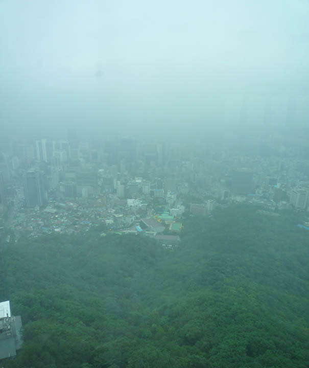 On my last day in Seoul the weather was looking a little iffy (thanks, Typhoon Kompasu) and I’d had three straight days of museums and markets, so I decided to take a break from all that darn culture and went to N Seoul Tower, a bonafide tourist attraction that promises great views of the city. Well, it wasn’t exactly a clear day: