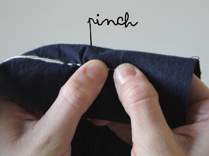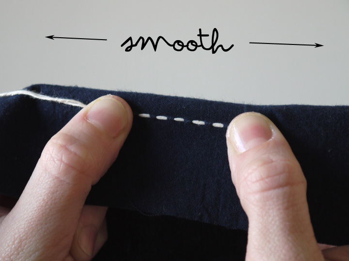 If you notice your fabric is puckering, then your stitches are too tight. To fix this pinch the fabric between your thumb and index finger and run them along your line of stitches to smooth the fabric. Try holding the knotted end steady with one hand while you smooth with the other.