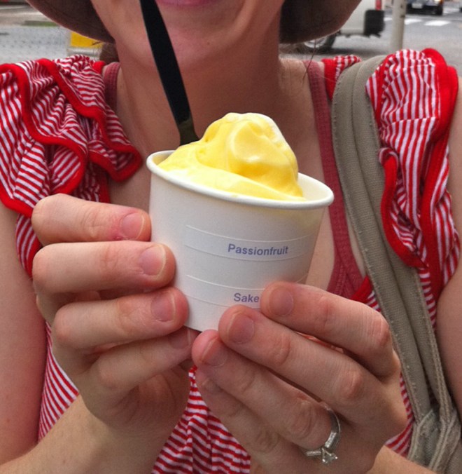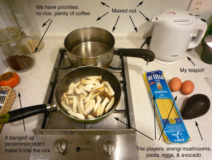 Look at that tiny little range! Two burners, and no oven. Not even a fish broiler. There go my dreams of opening a sidewalk pie stand. Sorry, Tokyo, your loss.