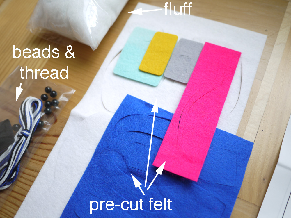 The kit comes with a 10 cm zipper, precut felt circles, plastic button parts, and a small cell phone strap. Here is the part that had me stumped: