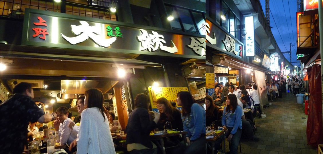 From there, we walked south to Ueno Park, famous for its springtime cherry blossoms and home to the Tokyo National Museum, The National Science Museum and The National Museum of Western Art. Because it was getting dark, we decided to visit the museums another day and instead wandered to the Ueno station area, looking for dinner. Under the train tracks, the nightlife was starting to get loud, and we found 大統領 (Daitouryou, or President) a bumpin’ little izakaya (bar that serves food) and had to stop. There were no English menus or photos in sight, but the smells of the grill drew us in.