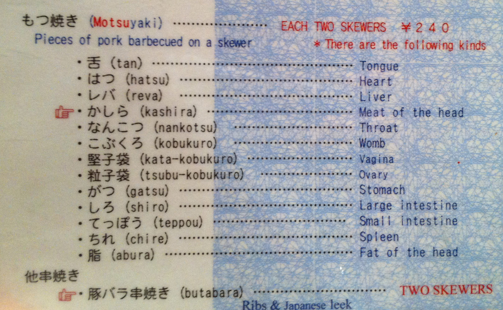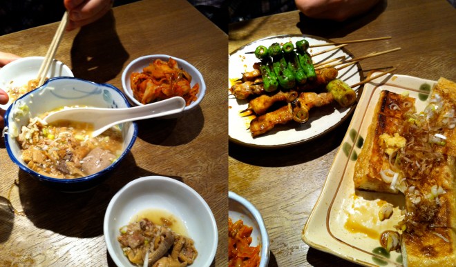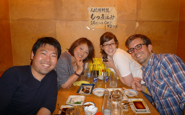 With tables spilling out onto the alley, smoke and beer and grilled meats aplenty, shouting patrons trying to converse over the rattle of the train above, Dan and I sat down and realized our task ahead — that we would actually have to order something. Our method of choice thus far has been to blindly point at the menu, hope for a few winners, or at the very least for something identifiable. In the super-packed restaurant, we were seated in a booth with another couple, and I’m sure my panic-stricken face was enough to clue them into our situation. Tomo and Nana became fast friends as they helped us order (though I realized a language barrier still existed when we ended up with a plate of assorted grilled chicken innards, the house specialty, which surprisingly I enjoyed) and introduced us to shōchū (Japanese liquor tasting sort of like vodka). I followed Nana’s lead and drank my shōchū with sour lemon soda. Dan and Tomo drank their sweet potato shōchū (mojōchū) straight up.