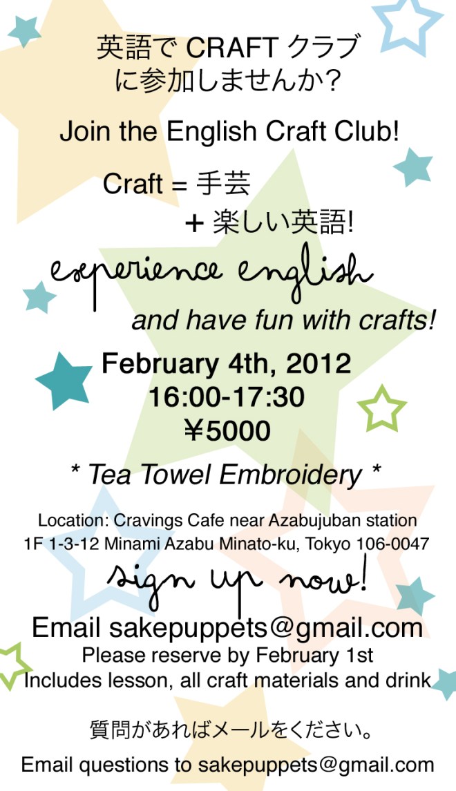 The English Craft Club に参加をご希望の方は、sakepuppets@gmail.comでご連絡下さい。ご質問もお気軽にどうぞ(英語・日本語どちらでも結構です)
