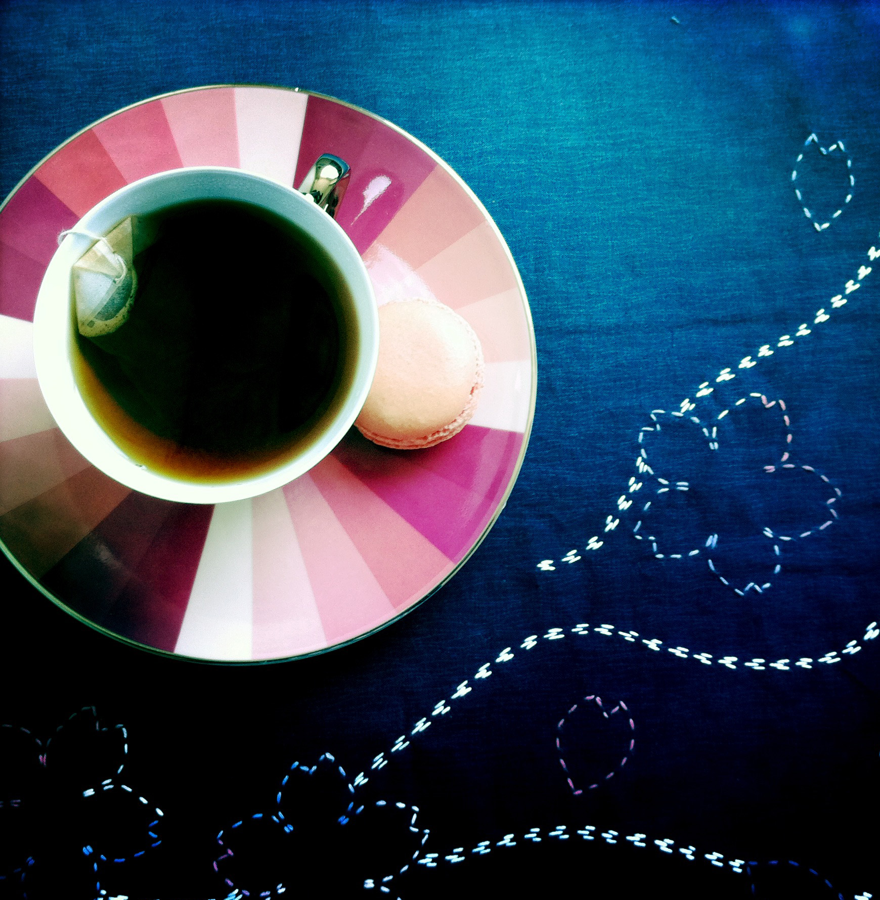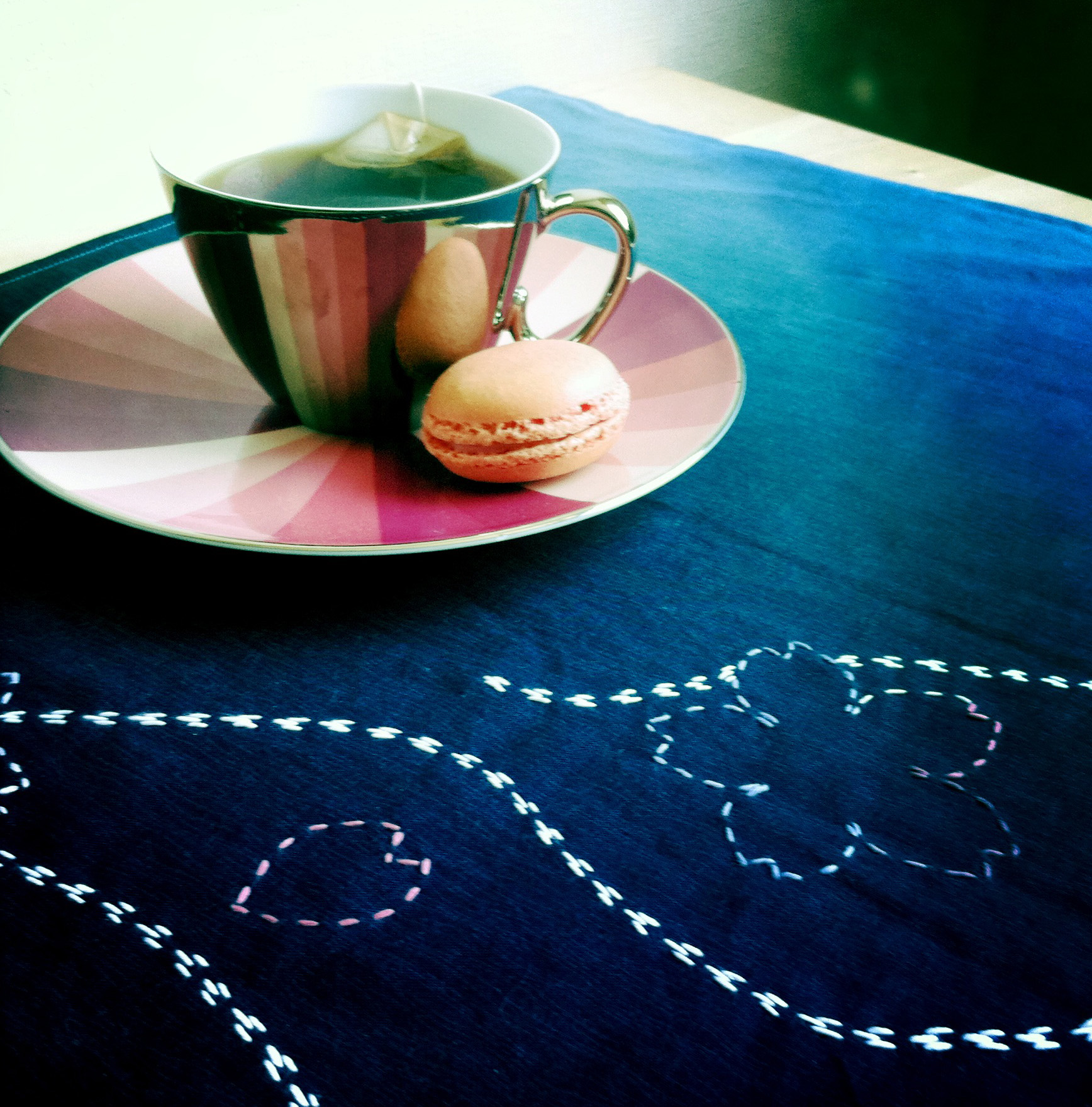 My fancy pink teacup, a raspberry macaron, and my newest sashiko kit (coming soon!), a sakura-covered picnic mat. It was a very sweet day.