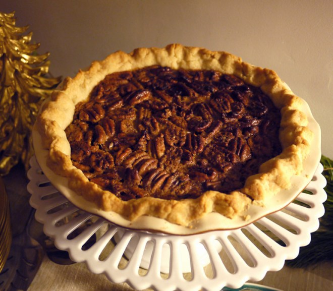I was responsible for at least a pound of that edible gold. For Christmas eve dinner I made two of my favorite pie recipes — deep-dish winter fruit and bourbon pecan.