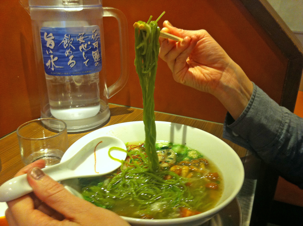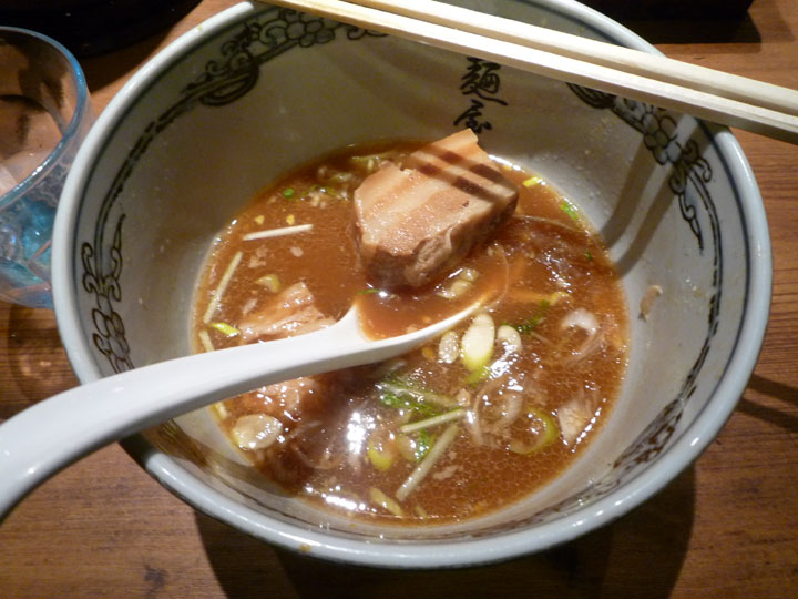 But when I sat down, all I saw was a giant vat of gurgling gray pork mess. The ramen chef had a tub of pork meat, and would occasionally pull out a hacked-off piece of cooked pig. The fat slid down his arms. All of his fingers were heavily bandaged. I took a sip of water to stop thinking about what his fingers looked like under those grease-trapping bandages.