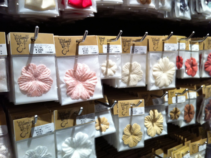 The crown jewel of the day, maybe my entire week, was the Hello Kitty + Liberty of London limited edition cotton prints. Both have a dedicated cult following (many of you know about my little Liberty crush), and they’ve combined forces to produce some of the most whimsical and lovely fabric I’ve seen. I stood there for a while trying to come up with a project idea worth the 3200 yen per meter price tag (almost US$40 per yard), but in the end I decided I couldn’t love Ms. Kitty quite enough.