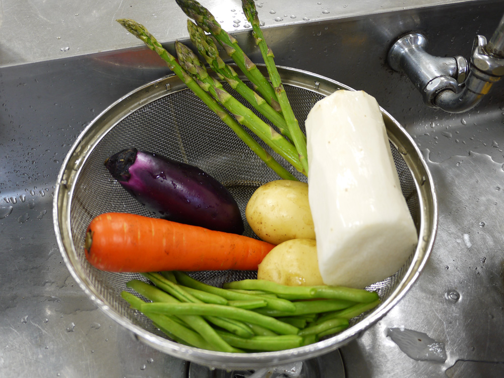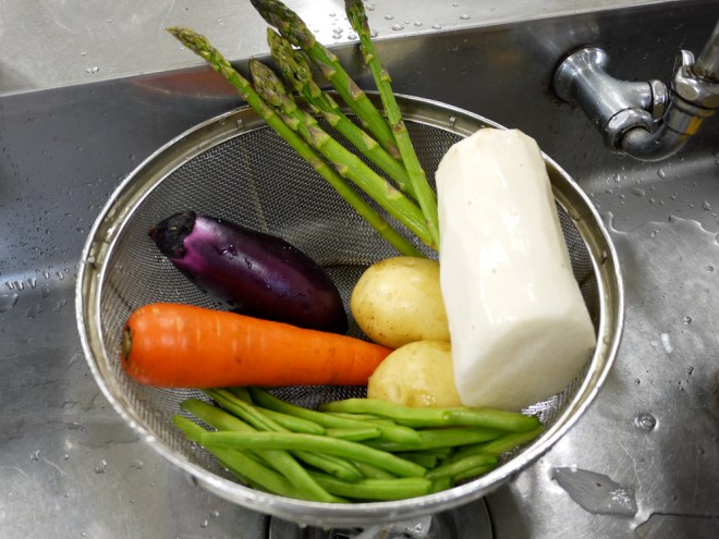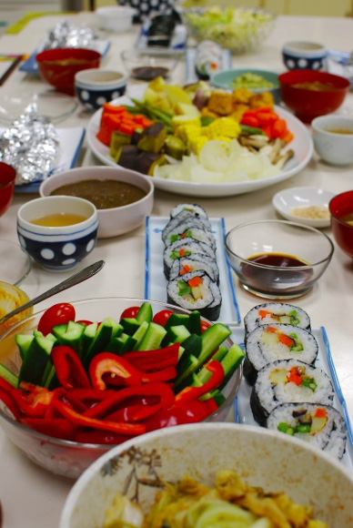 On the menu: fish cooked with miso, makizushi (rolled sushi) with deep-fried vegetables, soup made with dashi (fish stock), cabbage with kombu (dried kelp), and steamed vegetables with avocado-mayo and sesame dipping sauces.